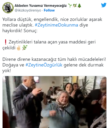Zeytinliklerini savunmak için Muğla'dan Ankara'ya gelen İkizköylüler, kararla ilgili sosyal medya hesaplarından yaptıkları açıklamada şöyle dedi: