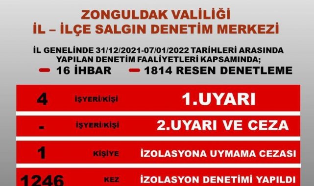 Zonguldak Valiliği İl/İlçe Salgın Denetim Merkezi il genelinde 31 Aralık 2021-7 Ocak 2022 tarihleri arasında yapılan denetim faaliyetlerini açıkladı. Buna göre 16 ihbar değerlendirildi. Bin 814 resen denetleme yapıldı. 4 işyeri/kişi birinci uyarı yapıldı. Bir kişiye izolasyona uymama cezası uygulandı. Bin 246 kez izolasyon denetimi yapıldı.