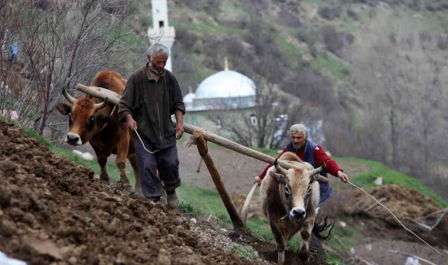 Gümüşhane'nin yüksek dağ köylerinde vatandaşlar aşırı eğimli tarlalarını asırlardır olduğu gibi bir çift öküzün ardına bağladıkları karasabanla sürmeye devam ediyor.